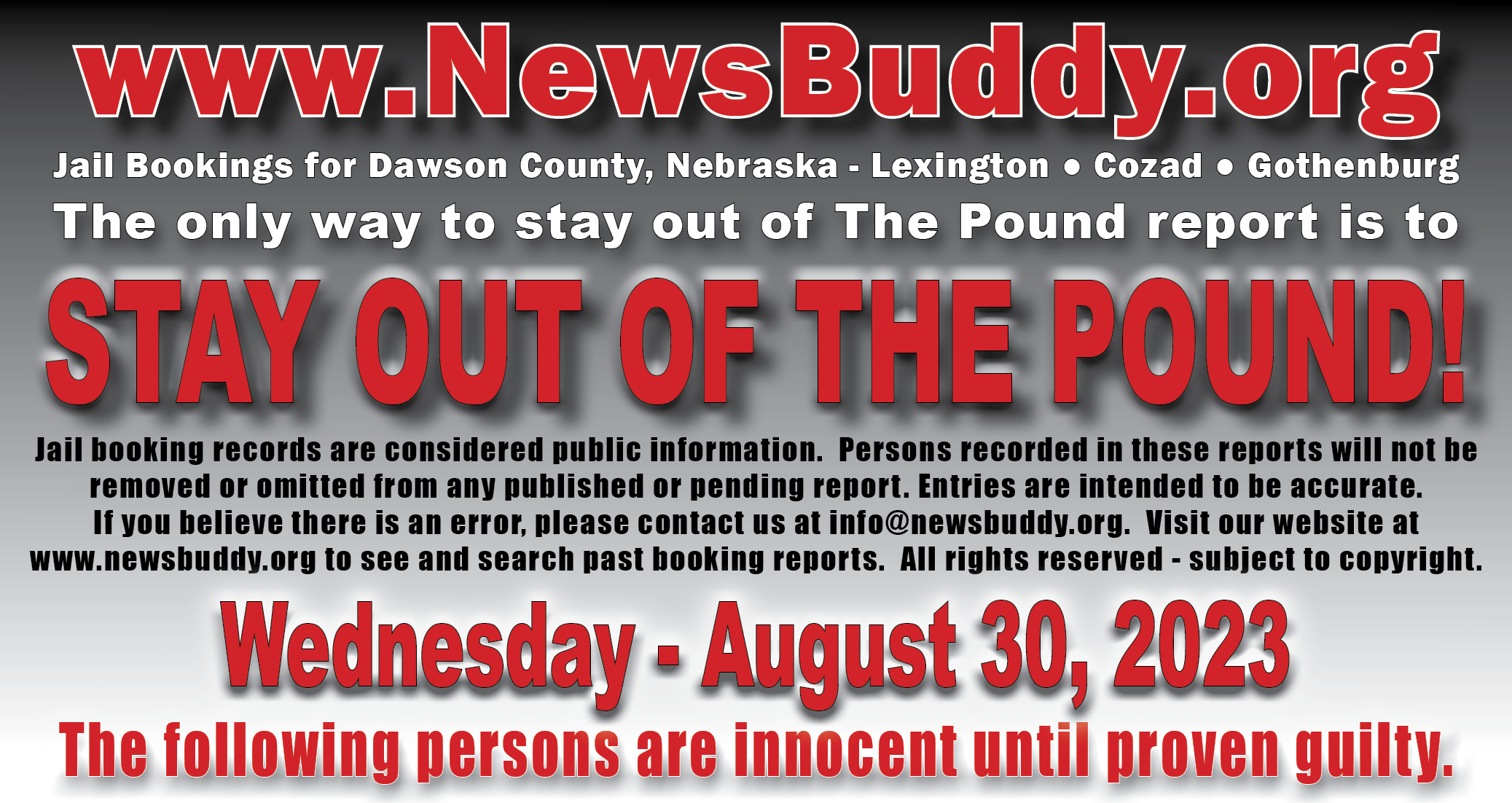 [et_pb_section fb_built=”1″ fullwidth=”on” _builder_version=”4.16″ _module_preset=”default” global_colors_info=”{}”][et_pb_fullwidth_header title=”Arrest and Booking Report” text_orientation=”center” button_one_text=”See our Facebook Page” button_one_url=”https://www.facebook.com/NEthepound” _builder_version=”4.16″ _module_preset=”default” title_font=”|700||||on|||” title_text_color=”#000000″ title_font_size=”29px” title_letter_spacing=”3px” content_font=”|||||on|||” content_text_color=”#d6d6d6″ content_font_size=”13px” content_line_height=”1.6em” use_background_color_gradient=”on” background_color_gradient_stops=”#ff3233 0%|#0a0000 100%” background_color_gradient_start=”#ff3233″ background_color_gradient_end=”#0a0000″ custom_button_one=”on” button_one_text_size=”11px” button_one_text_color=”#000000″ button_one_bg_use_color_gradient=”on” button_one_bg_color_gradient_type=”circular” button_one_bg_color_gradient_stops=”#d6d6d6 29%|#8f8f8f 100%” button_one_bg_color_gradient_start=”#d6d6d6″ button_one_bg_color_gradient_start_position=”29%” button_one_bg_color_gradient_end=”#8f8f8f” button_one_border_width=”0px” button_one_border_radius=”68px” button_one_font=”|800|||||||” link_option_url_new_window=”on” box_shadow_style_button_one=”preset1″ box_shadow_color_button_one=”#000000″ global_colors_info=”{}”]This statement does not indicate criminal record. Persons in this statement are presumed innocent until proven guilty in a court of law.[/et_pb_fullwidth_header][/et_pb_section][et_pb_section fb_built=”1″ _builder_version=”4.18.0″ _module_preset=”default” global_colors_info=”{}”][et_pb_row _builder_version=”4.17.6″ _module_preset=”default” global_colors_info=”{}”][et_pb_column type=”4_4″ _builder_version=”4.16″ _module_preset=”default” global_colors_info=”{}”][et_pb_team_member name=”Amy Irene Einspahr” position=”49 – Gothenburg, NE; 08/30/23 @ 00:15″ name_last_edited=”off|phone” _builder_version=”4.19.4″ _module_preset=”default” hover_enabled=”0″ global_colors_info=”{}” name__hover_enabled=”off|desktop” title_text=”Einspahr, Amy Irene” image_url=”https://newsbuddy.org/wp-content/uploads/2023/09/Einspahr-Amy-Irene.jpeg” sticky_enabled=”0″]
