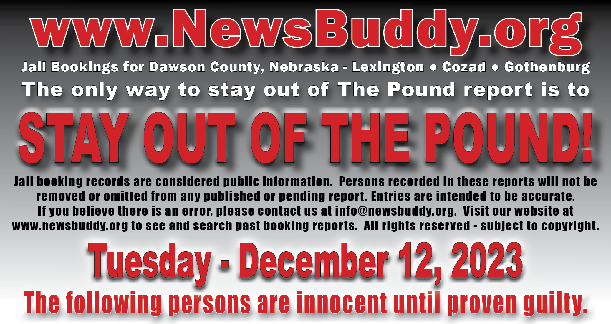 [et_pb_section fb_built=”1″ fullwidth=”on” _builder_version=”4.16″ _module_preset=”default” global_colors_info=”{}”][et_pb_fullwidth_header title=”Arrest and Booking Report” text_orientation=”center” button_one_text=”See our Facebook Page” button_one_url=”https://www.facebook.com/NEthepound” _builder_version=”4.16″ _module_preset=”default” title_font=”|700||||on|||” title_text_color=”#000000″ title_font_size=”29px” title_letter_spacing=”3px” content_font=”|||||on|||” content_text_color=”#d6d6d6″ content_font_size=”13px” content_line_height=”1.6em” use_background_color_gradient=”on” background_color_gradient_stops=”#ff3233 0%|#0a0000 100%” background_color_gradient_start=”#ff3233″ background_color_gradient_end=”#0a0000″ custom_button_one=”on” button_one_text_size=”11px” button_one_text_color=”#000000″ button_one_bg_use_color_gradient=”on” button_one_bg_color_gradient_type=”circular” button_one_bg_color_gradient_stops=”#d6d6d6 29%|#8f8f8f 100%” button_one_bg_color_gradient_start=”#d6d6d6″ button_one_bg_color_gradient_start_position=”29%” button_one_bg_color_gradient_end=”#8f8f8f” button_one_border_width=”0px” button_one_border_radius=”68px” button_one_font=”|800|||||||” link_option_url_new_window=”on” box_shadow_style_button_one=”preset1″ box_shadow_color_button_one=”#000000″ global_colors_info=”{}”]This statement does not indicate criminal record. Persons in this statement are presumed innocent until proven guilty in a court of law.[/et_pb_fullwidth_header][/et_pb_section][et_pb_section fb_built=”1″ _builder_version=”4.18.0″ _module_preset=”default” global_colors_info=”{}”][et_pb_row _builder_version=”4.17.6″ _module_preset=”default” hover_enabled=”0″ global_colors_info=”{}” sticky_enabled=”0″][et_pb_column type=”4_4″ _builder_version=”4.16″ _module_preset=”default” global_colors_info=”{}”][et_pb_team_member name=”Sam, John” position=”51 – Cozad, NE; 12/12/23 @ 02:40″ name_last_edited=”off|phone” _builder_version=”4.19.4″ _module_preset=”default” hover_enabled=”0″ global_colors_info=”{}” name__hover_enabled=”off|desktop” title_text=”Sam, John” image_url=”https://newsbuddy.org/wp-content/uploads/2023/12/Sam-John.jpg” sticky_enabled=”0″]