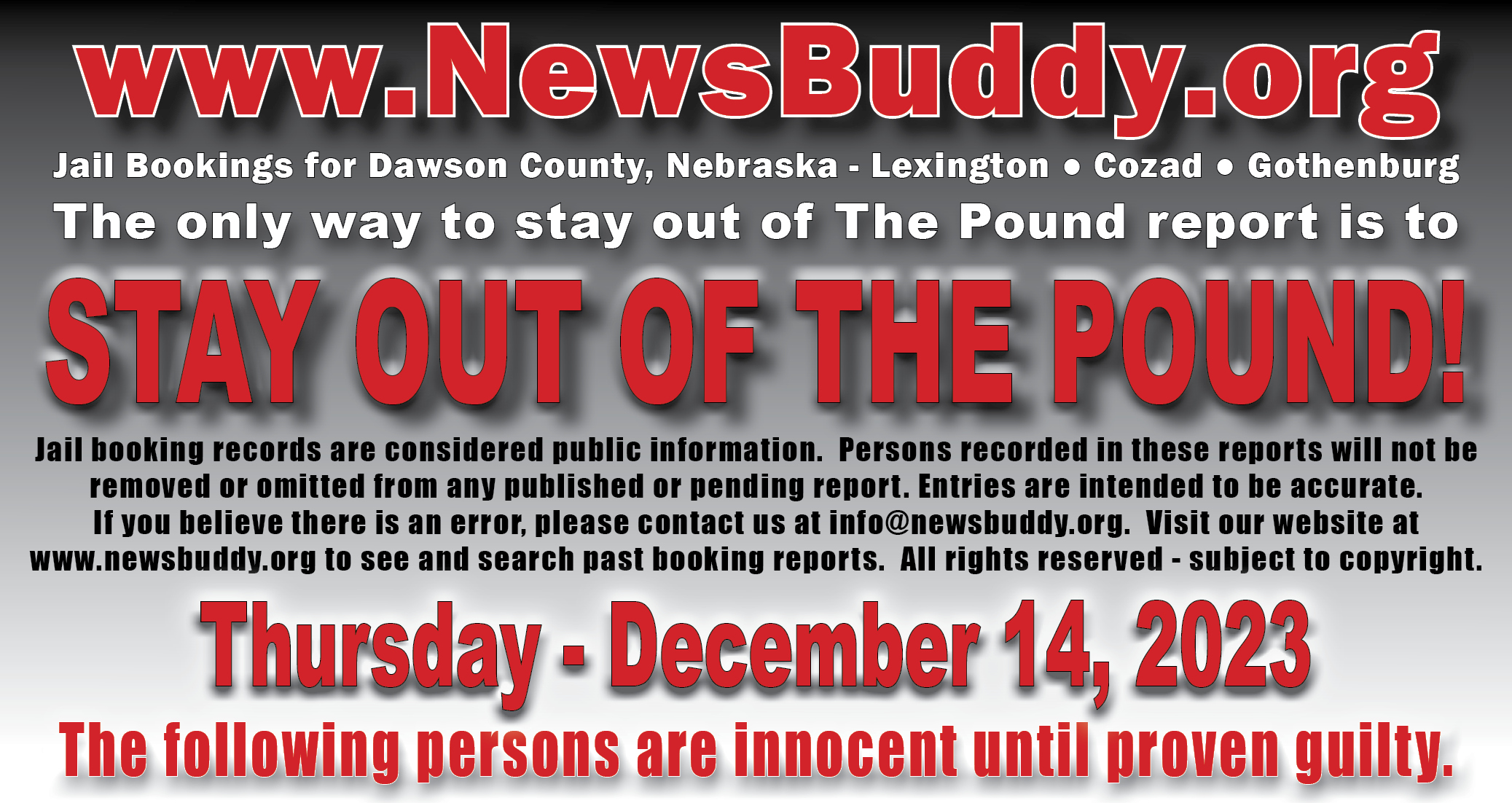 [et_pb_section fb_built=”1″ fullwidth=”on” _builder_version=”4.16″ _module_preset=”default” global_colors_info=”{}”][et_pb_fullwidth_header title=”Arrest and Booking Report” text_orientation=”center” button_one_text=”See our Facebook Page” button_one_url=”https://www.facebook.com/NEthepound” _builder_version=”4.16″ _module_preset=”default” title_font=”|700||||on|||” title_text_color=”#000000″ title_font_size=”29px” title_letter_spacing=”3px” content_font=”|||||on|||” content_text_color=”#d6d6d6″ content_font_size=”13px” content_line_height=”1.6em” use_background_color_gradient=”on” background_color_gradient_stops=”#ff3233 0%|#0a0000 100%” background_color_gradient_start=”#ff3233″ background_color_gradient_end=”#0a0000″ custom_button_one=”on” button_one_text_size=”11px” button_one_text_color=”#000000″ button_one_bg_use_color_gradient=”on” button_one_bg_color_gradient_type=”circular” button_one_bg_color_gradient_stops=”#d6d6d6 29%|#8f8f8f 100%” button_one_bg_color_gradient_start=”#d6d6d6″ button_one_bg_color_gradient_start_position=”29%” button_one_bg_color_gradient_end=”#8f8f8f” button_one_border_width=”0px” button_one_border_radius=”68px” button_one_font=”|800|||||||” link_option_url_new_window=”on” box_shadow_style_button_one=”preset1″ box_shadow_color_button_one=”#000000″ global_colors_info=”{}”]This statement does not indicate criminal record. Persons in this statement are presumed innocent until proven guilty in a court of law.[/et_pb_fullwidth_header][/et_pb_section][et_pb_section fb_built=”1″ _builder_version=”4.18.0″ _module_preset=”default” global_colors_info=”{}”][et_pb_row _builder_version=”4.17.6″ _module_preset=”default” global_colors_info=”{}”][et_pb_column type=”4_4″ _builder_version=”4.16″ _module_preset=”default” global_colors_info=”{}”][et_pb_team_member name=”Wilcox, Marcus Jay” position=”27 – Lexington, NE; 12/14/23 @ 05:55″ name_last_edited=”off|phone” _builder_version=”4.19.4″ _module_preset=”default” hover_enabled=”0″ global_colors_info=”{}” name__hover_enabled=”off|desktop” title_text=”Wilcox, Marcus Jay” image_url=”https://newsbuddy.org/wp-content/uploads/2023/12/Wilcox-Marcus-Jay.jpg” sticky_enabled=”0″]