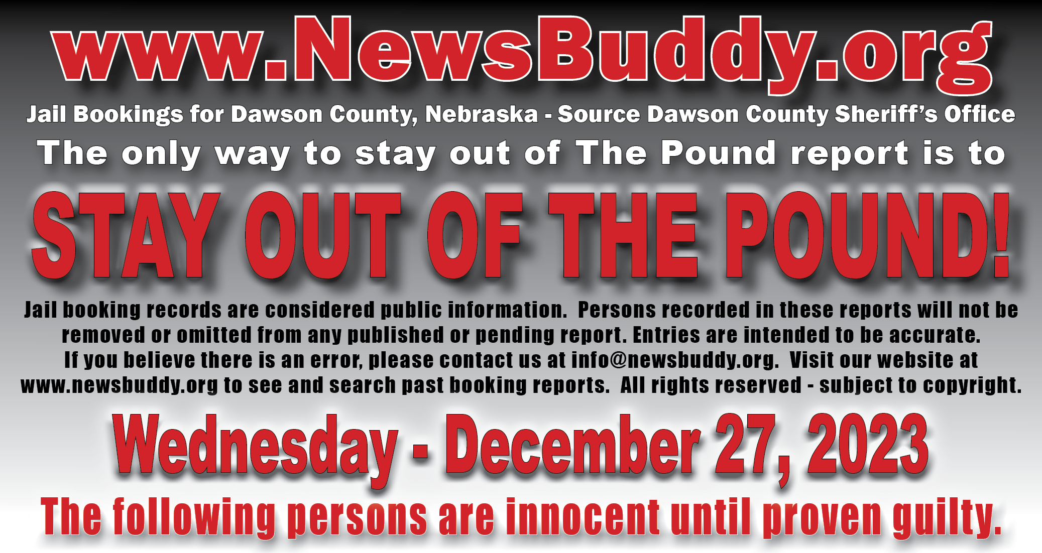 [et_pb_section fb_built=”1″ fullwidth=”on” _builder_version=”4.16″ _module_preset=”default” global_colors_info=”{}”][et_pb_fullwidth_header title=”Arrest and Booking Report” text_orientation=”center” button_one_text=”See our Facebook Page” button_one_url=”https://www.facebook.com/NEthepound” _builder_version=”4.16″ _module_preset=”default” title_font=”|700||||on|||” title_text_color=”#000000″ title_font_size=”29px” title_letter_spacing=”3px” content_font=”|||||on|||” content_text_color=”#d6d6d6″ content_font_size=”13px” content_line_height=”1.6em” use_background_color_gradient=”on” background_color_gradient_stops=”#ff3233 0%|#0a0000 100%” background_color_gradient_start=”#ff3233″ background_color_gradient_end=”#0a0000″ custom_button_one=”on” button_one_text_size=”11px” button_one_text_color=”#000000″ button_one_bg_use_color_gradient=”on” button_one_bg_color_gradient_type=”circular” button_one_bg_color_gradient_stops=”#d6d6d6 29%|#8f8f8f 100%” button_one_bg_color_gradient_start=”#d6d6d6″ button_one_bg_color_gradient_start_position=”29%” button_one_bg_color_gradient_end=”#8f8f8f” button_one_border_width=”0px” button_one_border_radius=”68px” button_one_font=”|800|||||||” link_option_url_new_window=”on” box_shadow_style_button_one=”preset1″ box_shadow_color_button_one=”#000000″ global_colors_info=”{}”]This statement does not indicate criminal record. Persons in this statement are presumed innocent until proven guilty in a court of law.[/et_pb_fullwidth_header][/et_pb_section][et_pb_section fb_built=”1″ _builder_version=”4.18.0″ _module_preset=”default” global_colors_info=”{}”][et_pb_row _builder_version=”4.17.6″ _module_preset=”default” global_colors_info=”{}”][et_pb_column type=”4_4″ _builder_version=”4.16″ _module_preset=”default” global_colors_info=”{}”][et_pb_team_member name=”Westgate, Tyler James” position=”22 – Cozad, NE; 12/27/23 @ 10:59″ name_last_edited=”off|phone” _builder_version=”4.19.4″ _module_preset=”default” hover_enabled=”0″ global_colors_info=”{}” name__hover_enabled=”off|desktop” title_text=”Westgate, Tyler James” image_url=”https://newsbuddy.org/wp-content/uploads/2023/12/Westgate-Tyler-James-1.jpg” sticky_enabled=”0″]