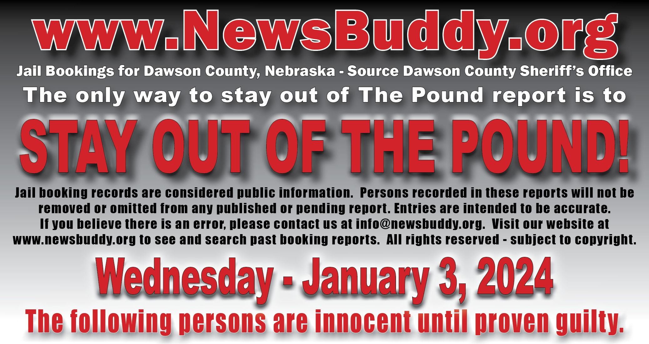 [et_pb_section fb_built=”1″ fullwidth=”on” _builder_version=”4.16″ _module_preset=”default” global_colors_info=”{}”][et_pb_fullwidth_header title=”Arrest and Booking Report” text_orientation=”center” button_one_text=”See our Facebook Page” button_one_url=”https://www.facebook.com/NEthepound” _builder_version=”4.16″ _module_preset=”default” title_font=”|700||||on|||” title_text_color=”#000000″ title_font_size=”29px” title_letter_spacing=”3px” content_font=”|||||on|||” content_text_color=”#d6d6d6″ content_font_size=”13px” content_line_height=”1.6em” use_background_color_gradient=”on” background_color_gradient_stops=”#ff3233 0%|#0a0000 100%” background_color_gradient_start=”#ff3233″ background_color_gradient_end=”#0a0000″ custom_button_one=”on” button_one_text_size=”11px” button_one_text_color=”#000000″ button_one_bg_use_color_gradient=”on” button_one_bg_color_gradient_type=”circular” button_one_bg_color_gradient_stops=”#d6d6d6 29%|#8f8f8f 100%” button_one_bg_color_gradient_start=”#d6d6d6″ button_one_bg_color_gradient_start_position=”29%” button_one_bg_color_gradient_end=”#8f8f8f” button_one_border_width=”0px” button_one_border_radius=”68px” button_one_font=”|800|||||||” link_option_url_new_window=”on” box_shadow_style_button_one=”preset1″ box_shadow_color_button_one=”#000000″ global_colors_info=”{}”]This statement does not indicate criminal record. Persons in this statement are presumed innocent until proven guilty in a court of law.[/et_pb_fullwidth_header][/et_pb_section][et_pb_section fb_built=”1″ _builder_version=”4.19.4″ _module_preset=”default” global_colors_info=”{}”][et_pb_row _builder_version=”4.17.6″ _module_preset=”default” global_colors_info=”{}”][et_pb_column type=”4_4″ _builder_version=”4.16″ _module_preset=”default” global_colors_info=”{}”][et_pb_team_member name=”Fedorchik, Austen Mikel” position=”21 – Cozad, NE; 1/3/24 @ 15:30″ name_last_edited=”off|phone” _builder_version=”4.19.4″ _module_preset=”default” hover_enabled=”0″ global_colors_info=”{}” name__hover_enabled=”off|desktop” title_text=”Fedorchik, Austen Mikel” image_url=”https://newsbuddy.org/wp-content/uploads/2024/01/Fedorchik-Austen-Mikel.jpg” sticky_enabled=”0″]