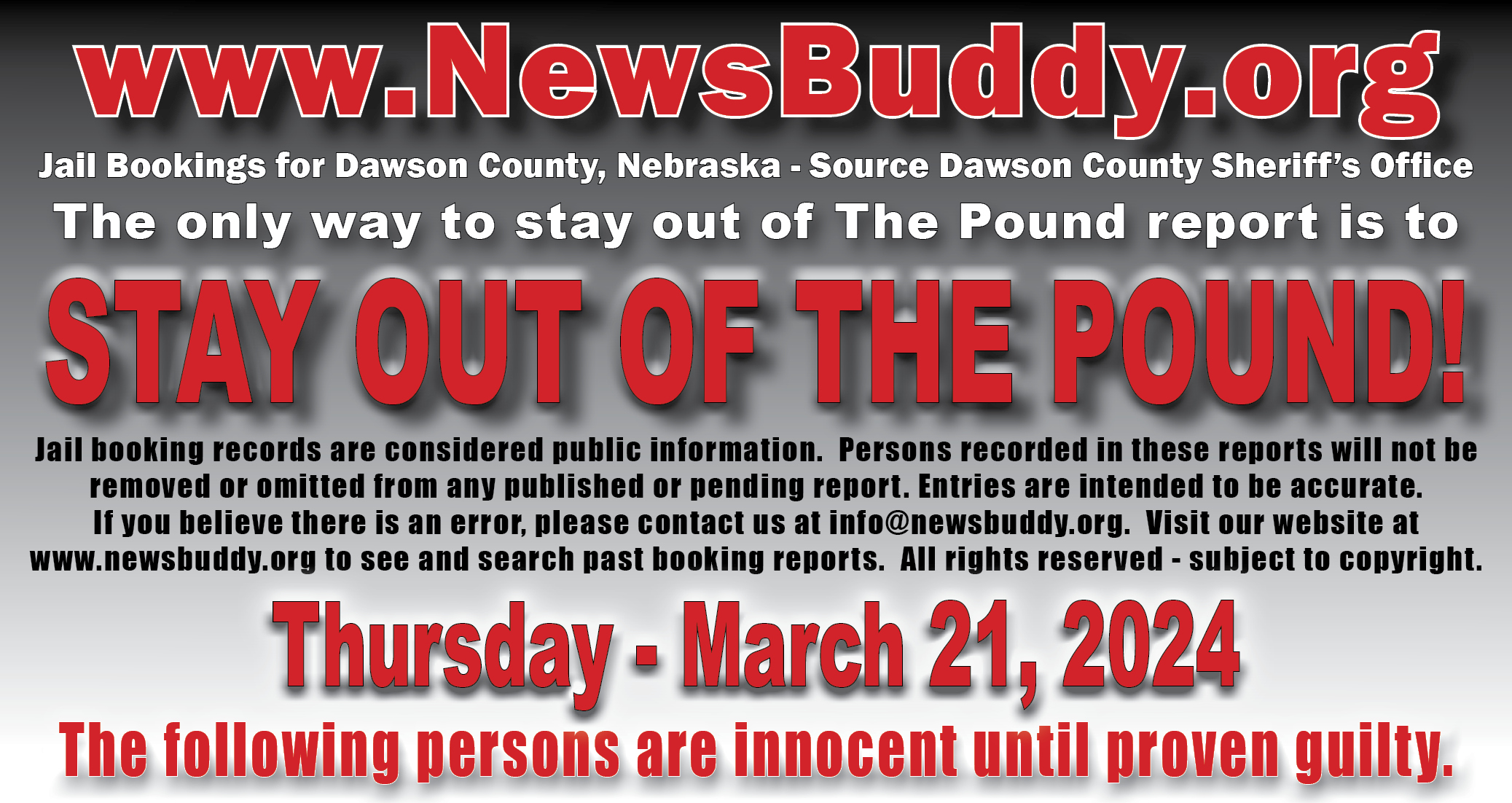 [et_pb_section fb_built=”1″ fullwidth=”on” _builder_version=”4.16″ _module_preset=”default” global_colors_info=”{}”][et_pb_fullwidth_header title=”Arrest and Booking Report” text_orientation=”center” button_one_text=”See our Facebook Page” button_one_url=”https://www.facebook.com/NEthepound” _builder_version=”4.16″ _module_preset=”default” title_font=”|700||||on|||” title_text_color=”#000000″ title_font_size=”29px” title_letter_spacing=”3px” content_font=”|||||on|||” content_text_color=”#d6d6d6″ content_font_size=”13px” content_line_height=”1.6em” use_background_color_gradient=”on” background_color_gradient_stops=”#ff3233 0%|#0a0000 100%” background_color_gradient_start=”#ff3233″ background_color_gradient_end=”#0a0000″ custom_button_one=”on” button_one_text_size=”11px” button_one_text_color=”#000000″ button_one_bg_use_color_gradient=”on” button_one_bg_color_gradient_type=”circular” button_one_bg_color_gradient_stops=”#d6d6d6 29%|#8f8f8f 100%” button_one_bg_color_gradient_start=”#d6d6d6″ button_one_bg_color_gradient_start_position=”29%” button_one_bg_color_gradient_end=”#8f8f8f” button_one_border_width=”0px” button_one_border_radius=”68px” button_one_font=”|800|||||||” link_option_url_new_window=”on” box_shadow_style_button_one=”preset1″ box_shadow_color_button_one=”#000000″ global_colors_info=”{}”]This statement does not indicate criminal record. Persons in this statement are presumed innocent until proven guilty in a court of law.[/et_pb_fullwidth_header][/et_pb_section][et_pb_section fb_built=”1″ _builder_version=”4.19.4″ _module_preset=”default” global_colors_info=”{}”][et_pb_row _builder_version=”4.17.6″ _module_preset=”default” global_colors_info=”{}”][et_pb_column type=”4_4″ _builder_version=”4.16″ _module_preset=”default” global_colors_info=”{}”][et_pb_team_member name=”McManus, Ryan Patrick” position=”49 – Johnson Lake, NE; 3/21/24 @ 08:46″ name_last_edited=”off|phone” _builder_version=”4.19.4″ _module_preset=”default” hover_enabled=”0″ global_colors_info=”{}” name__hover_enabled=”off|desktop” title_text=”McManus, Ryan Patrick” image_url=”https://newsbuddy.org/wp-content/uploads/2024/03/McManus-Ryan-Patrick.jpg” sticky_enabled=”0″]