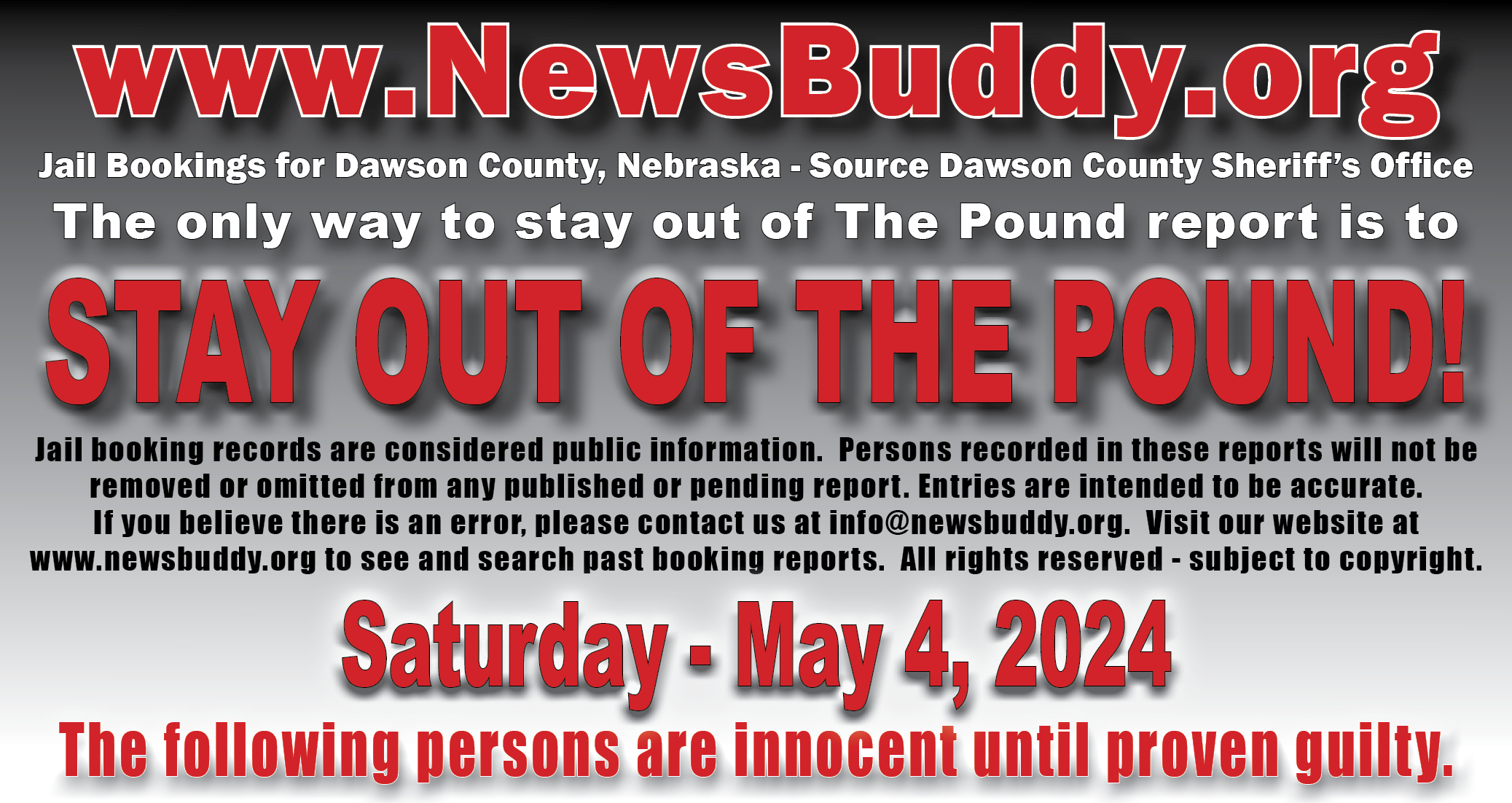 [et_pb_section fb_built=”1″ fullwidth=”on” _builder_version=”4.16″ _module_preset=”default” global_colors_info=”{}”][et_pb_fullwidth_header title=”Arrest and Booking Report” text_orientation=”center” button_one_text=”See our Facebook Page” button_one_url=”https://www.facebook.com/NEthepound” _builder_version=”4.16″ _module_preset=”default” title_font=”|700||||on|||” title_text_color=”#000000″ title_font_size=”29px” title_letter_spacing=”3px” content_font=”|||||on|||” content_text_color=”#d6d6d6″ content_font_size=”13px” content_line_height=”1.6em” use_background_color_gradient=”on” background_color_gradient_stops=”#ff3233 0%|#0a0000 100%” background_color_gradient_start=”#ff3233″ background_color_gradient_end=”#0a0000″ custom_button_one=”on” button_one_text_size=”11px” button_one_text_color=”#000000″ button_one_bg_use_color_gradient=”on” button_one_bg_color_gradient_type=”circular” button_one_bg_color_gradient_stops=”#d6d6d6 29%|#8f8f8f 100%” button_one_bg_color_gradient_start=”#d6d6d6″ button_one_bg_color_gradient_start_position=”29%” button_one_bg_color_gradient_end=”#8f8f8f” button_one_border_width=”0px” button_one_border_radius=”68px” button_one_font=”|800|||||||” link_option_url_new_window=”on” box_shadow_style_button_one=”preset1″ box_shadow_color_button_one=”#000000″ global_colors_info=”{}”]This statement does not indicate criminal record. Persons in this statement are presumed innocent until proven guilty in a court of law.[/et_pb_fullwidth_header][/et_pb_section][et_pb_section fb_built=”1″ _builder_version=”4.19.4″ _module_preset=”default” global_colors_info=”{}”][et_pb_row _builder_version=”4.17.6″ _module_preset=”default” global_colors_info=”{}”][et_pb_column type=”4_4″ _builder_version=”4.16″ _module_preset=”default” global_colors_info=”{}”][et_pb_team_member name=”Chavez-Munoz, Santiago N” position=”28 – Lexington, NE; 5/4/24 @ 10:30″ name_last_edited=”off|phone” _builder_version=”4.19.4″ _module_preset=”default” hover_enabled=”0″ global_colors_info=”{}” name__hover_enabled=”off|desktop” title_text=”Chavez-Munoz, Santiago N” image_url=”https://newsbuddy.org/wp-content/uploads/2024/05/Chavez-Munoz-Santiago-N.jpg” sticky_enabled=”0″]